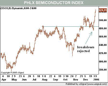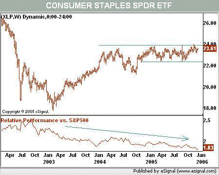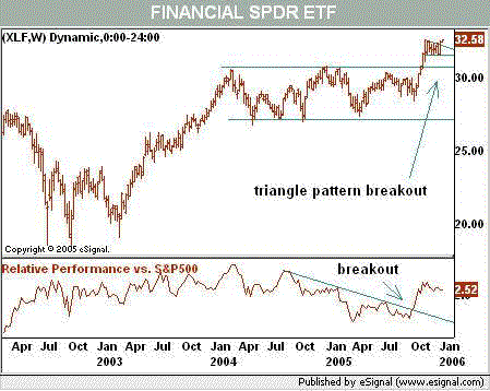 Vraťme se však k finančnímu sektoru. Ten zařídil obrat z říjnových minim roku 2005, ale v prosinci se ukazatel relativní performence zastavil. Minulý pátek ETF finančního sektoru prorazil trojúhelníkovou sestavu a znovu se dává do pohybu vzhůru.