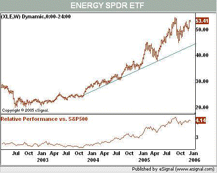 Není žádným tajemstvím, že energetický sektor byl v roce 2005 nejlépe performujícím a současně se po zářijovém poklesu vrací ke svému maximu. Spodní hranice signalizující rostoucí trend je pevně dána, ale i zde lze očekávat krátkodobý výkyv směrem dolů.