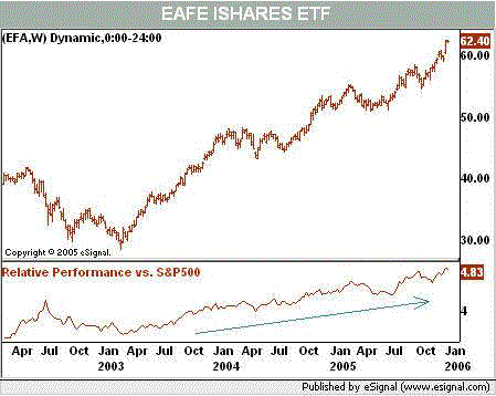 Posledním sektorovým ETF, na který by jste se mohli zaměřit bude EAFE iShares, jenž v sobě zahrnuje akcie z Evropy, Austrálie a dálného východu. Jeho vývoj byl od roku 2003 v porovnání s vývojem amerického trhu vždy lepší a také pro letošní rok se dá očekávat vyšší zisk než v roce 2006.