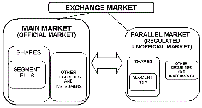 Varšavská burza je rozdělena na dva trhy: hlavní (oficiální) a paralelní (regulovaný neoficiální). Oba trhy mají dva segmenty (viz diagram).