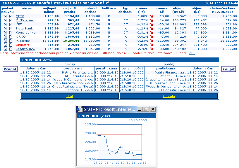 SPAD burzy, k dispozici je i tzv. hloubka trhu, tj. nákupní a prodejní příkazy tvůrců trhu seřazené od nejlepších kotací. Kromě toho samozřejmě monitorujeme i vývoj cen akcií v