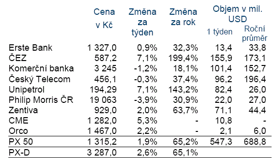 Český akciový trh měřený indexem PX 50 minulý týden vzrostl o 1,9 % na 1 315,2 bodů,