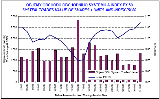 Celkové objemy obchodů s akciemi v květnu dosáhly 80,6 mld. Kč a více než dvojnásobně přesáhly objemy obchodů s dluhopisy. Meziročně jde o nárůst o 85 %. V dubnu 2005 však dosáhl objem akciových obchodů výše dokonce 118,3 mld. Kč. Index PX-50 v květnu posílil o 1,72 % po 2,73% poklesu v dubnu.