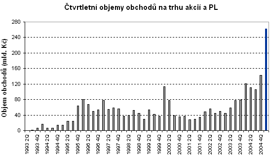 Nejúspěšnějším rokem na trhu akcií a PL se stal rok 2004, ve kterém objem obchodů dosáhl hodnoty 479,7 mld. Kč. Na počátku roku 2005 objem obchodů dále výrazně vzrostl. V lednu měsíční objem obchodů prvně překonal hranici 60 mld. Kč, v únoru hranici 70 mld. Kč. V březnu 2005 dosáhl hodnoty 122,7 mld. Kč a významně se tak podílel na novém čtvrtletním objemovém maximu 262,8 mld. Kč, které převýšilo objem z doposud nejúspěšnějšího 4. čtvrtletí 2004 o 84,3 %. Prvně v historii burzy překonal denní objem akciových obchodů hranici 10 mld. Kč dne 10. března 2005 - závěrečná hodnota realizovaných obchodů činila 10,9 mld. Kč.