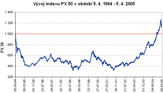 Oficiální burzovní index PX 50 zavedla burza 5. dubna 1994 s výchozí hodnotou 1 000 bodů. Index se většinou pohyboval hluboko pod výchozí hodnotou. Historického minima 316,0 bodu dosáhla závěrečná denní hodnota 8. října 1998. V roce 2004 zaznamenal index PX 50 rekordní meziroční nárůst o 56,6 % a uzavřel rok 2004 na hodnotě 1 032,0 bodu. Historické maximum závěrečných denních hodnot 1 262,7 bodu pochází z 10. března 2005.
