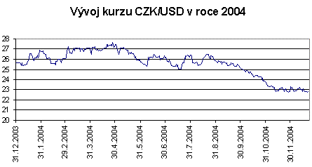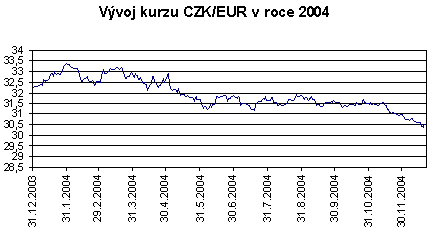 Rok 2004 byl ve znamení posilování koruny vůči oběma hlavním měnám. Od začátku roku do 22. prosince posílila koruna k euru nominálně o 5,3 % a k dolaru o 11,1 %. Vývoj koruny v roce 2004 lze orientačně rozdělit do 4 fází. Posilování k dolaru i euru, které bylo jejich základním rysem, by mělo pokračovat i na začátku roku 2005.