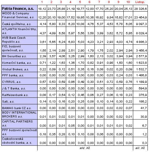 Tabulka: Objemy obchodů členů burzy v roce 2004 (zdroj: BCPP, a.s.)