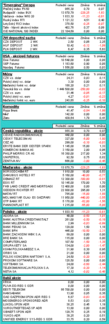 V následující tabulce naleznete přehled aktuální situace na akciových a finančních trzích střední a východní Evropy. Data jsou statická, nicméně bez markantního zpoždění (k času zveřejnění tohoto komentáře). Tabulky obsahují akciové indexy v regionu, kurzy středoevropských měn, vývoje regionálních blue-chips titulů a v neposlední řadě aktuální hodnotu futurit na americké akciové indexy.