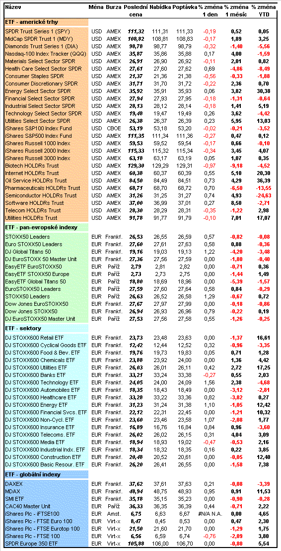 Patria přináší svým klientům přehled odpoledního vývoje tzv. Exchange Traded Funds (ETF). ETF jsou indexové podílové fondy, jejichž podkladovým aktivem je již existující index, které se obchodují jako akcie a umožňují tak investorům nakupovat nebo prodávat celé indexy ve formě jednoho konkrétního cenného papíru. Cena ETF se tvoří pohybem hodnoty jednotlivých indexů a nemůže tak dojít k odchylce mezi výkonností a výnosem daného indexu a jím sledovaného ETF. ETF jsou proto vyhledávaným produktem, který nahrazuje mnohdy nákladnější investování přes podílové fondy, jejichž tzv. „benchmarkem“ je vývoj daného burzovního indexu. V tabulce uvedené ceny jsou platné k okamžiku zveřejnění komentáře.