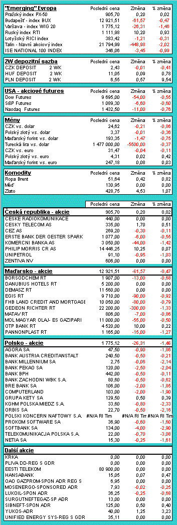 V následující tabulce naleznete přehled aktuální situace na akciových a finančních trzích střední a východní Evropy. Data jsou statická, nicméně bez markantního zpoždění (k času zveřejnění tohoto komentáře). Tabulky obsahují akciové indexy v regionu, kurzy středoevropských měn, vývoje regionálních blue-chips titulů a v neposlední řadě aktuální hodnotu futurit na americké akciové indexy.