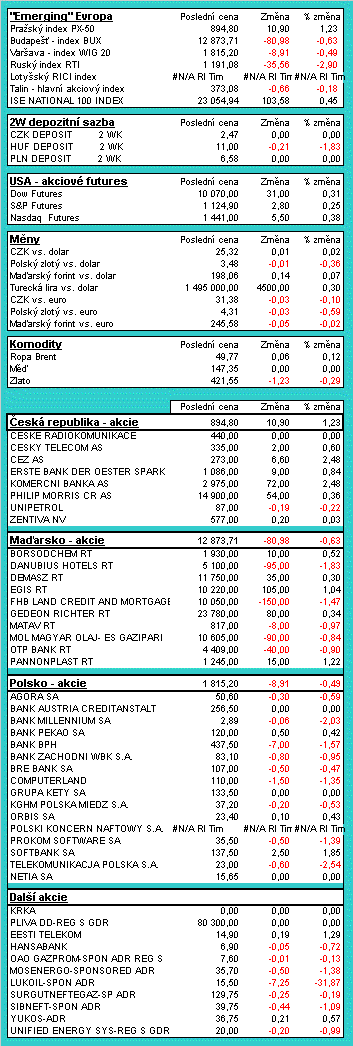 V následující tabulce naleznete přehled aktuální situace na akciových a finančních trzích střední a východní Evropy. Data jsou statická, nicméně bez markantního zpoždění (k času zveřejnění tohoto komentáře). Tabulky obsahují akciové indexy v regionu, kurzy středoevropských měn, vývoje regionálních blue-chips titulů a v neposlední řadě aktuální hodnotu futurit na americké akciové indexy.