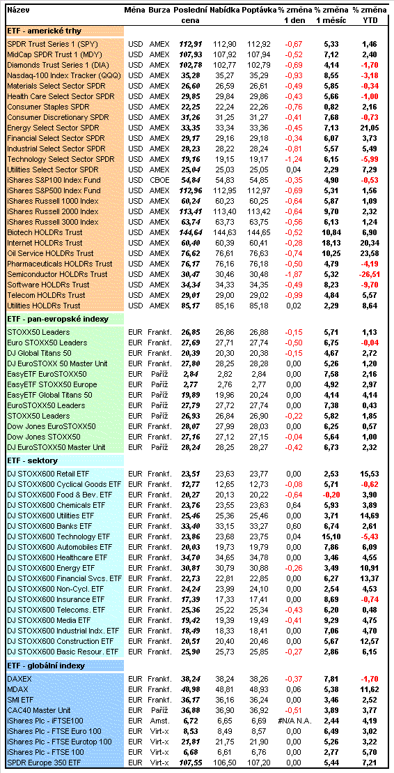 Patria přináší svým klientům přehled odpoledního vývoje tzv. Exchange Traded Funds (ETF). ETF jsou indexové podílové fondy, jejichž podkladovým aktivem je již existující index, které se obchodují jako akcie a umožňují tak investorům nakupovat nebo prodávat celé indexy ve formě jednoho konkrétního cenného papíru. Cena ETF se tvoří pohybem hodnoty jednotlivých indexů a nemůže tak dojít k odchylce mezi výkonností a výnosem daného indexu a jím sledovaného ETF. ETF jsou proto vyhledávaným produktem, který nahrazuje mnohdy nákladnější investování přes podílové fondy, jejichž tzv. „benchmarkem“ je vývoj daného burzovního indexu. V tabulce uvedené ceny jsou platné k okamžiku zveřejnění komentáře.