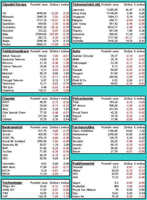V následující tabulce naleznete přehled aktuální situace na akciových trzích západní Evropy a tichomořské oblasti. Data jsou statická, nicméně bez markantního zpoždění (k času zveřejnění tohoto komentáře). Tabulky obsahují jednak akciové indexy v regionu, jednak jednotlivé sledované akciové tituly rozdělené dle odvětvové struktury.