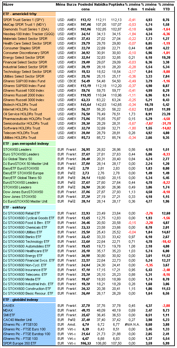 Patria přináší svým klientům přehled odpoledního vývoje tzv. Exchange Traded Funds (ETF). ETF jsou indexové podílové fondy, jejichž podkladovým aktivem je již existující index, které se obchodují jako akcie a umožňují tak investorům nakupovat nebo prodávat celé indexy ve formě jednoho konkrétního cenného papíru. Cena ETF se tvoří pohybem hodnoty jednotlivých indexů a nemůže tak dojít k odchylce mezi výkonností a výnosem daného indexu a jím sledovaného ETF. ETF jsou proto vyhledávaným produktem, který nahrazuje mnohdy nákladnější investování přes podílové fondy, jejichž tzv. „benchmarkem“ je vývoj daného burzovního indexu. V tabulce uvedené ceny jsou platné k okamžiku zveřejnění komentáře.