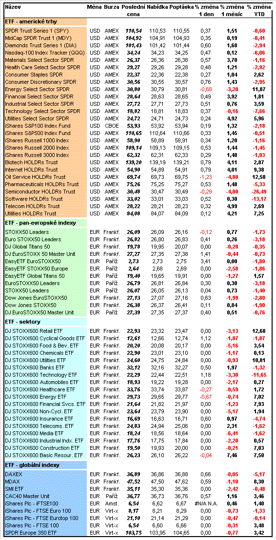 Patria přináší svým klientům přehled odpoledního vývoje tzv. Exchange Traded Funds (ETF). ETF jsou indexové podílové fondy, jejichž podkladovým aktivem je již existující index, které se obchodují jako akcie a umožňují tak investorům nakupovat nebo prodávat celé indexy ve formě jednoho konkrétního cenného papíru. Cena ETF se tvoří pohybem hodnoty jednotlivých indexů a nemůže tak dojít k odchylce mezi výkonností a výnosem daného indexu a jím sledovaného ETF. ETF jsou proto vyhledávaným produktem, který nahrazuje mnohdy nákladnější investování přes podílové fondy, jejichž tzv. „benchmarkem“ je vývoj daného burzovního indexu. V tabulce uvedené ceny jsou platné k okamžiku zveřejnění komentáře.