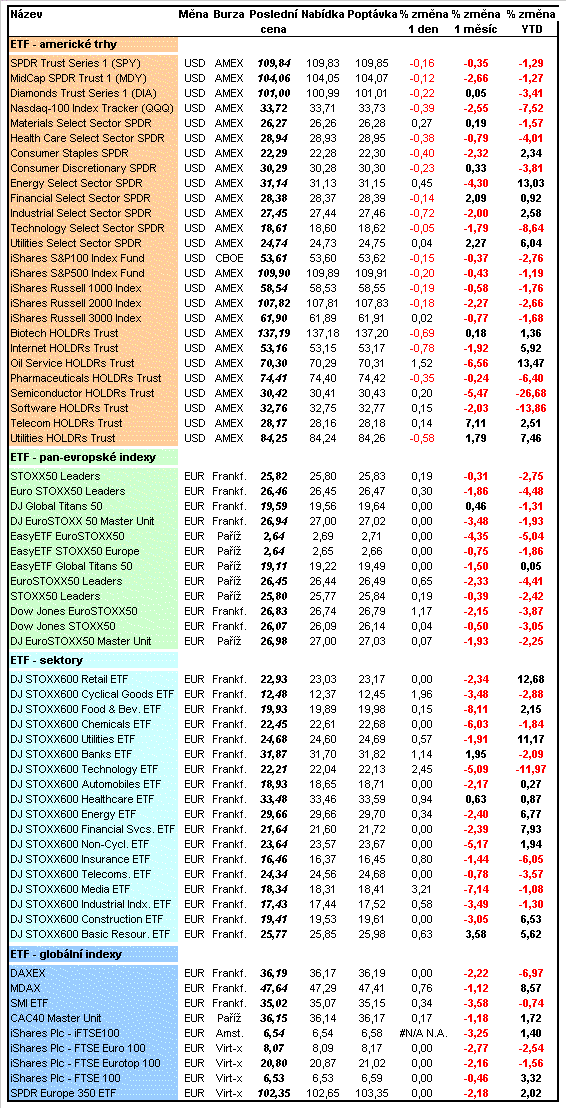 Patria přináší svým klientům přehled odpoledního vývoje tzv. Exchange Traded Funds (ETF). ETF jsou indexové podílové fondy, jejichž podkladovým aktivem je již existující index, které se obchodují jako akcie a umožňují tak investorům nakupovat nebo prodávat celé indexy ve formě jednoho konkrétního cenného papíru. Cena ETF se tvoří pohybem hodnoty jednotlivých indexů a nemůže tak dojít k odchylce mezi výkonností a výnosem daného indexu a jím sledovaného ETF. ETF jsou proto vyhledávaným produktem, který nahrazuje mnohdy nákladnější investování přes podílové fondy, jejichž tzv. „benchmarkem“ je vývoj daného burzovního indexu. V tabulce uvedené ceny jsou platné k okamžiku zveřejnění komentáře.