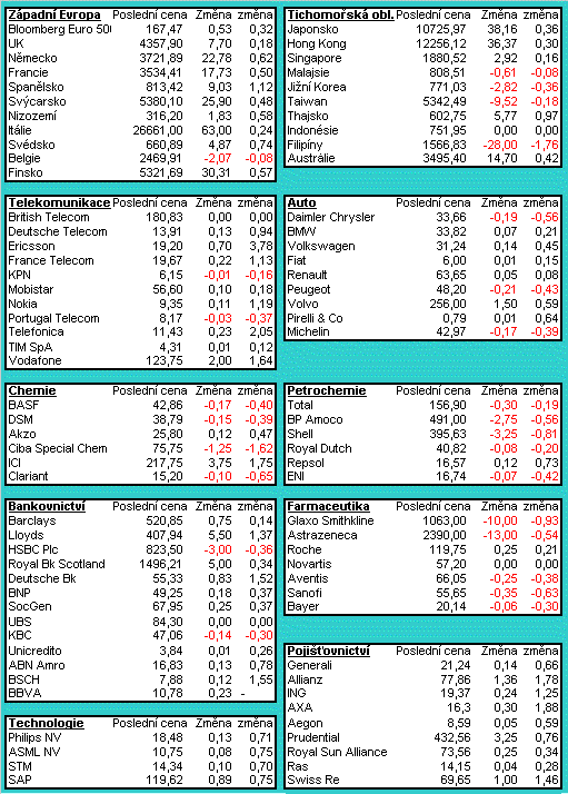 V následující tabulce naleznete přehled aktuální situace na akciových trzích západní Evropy a tichomořské oblasti. Data jsou statická, nicméně bez markantního zpoždění (k času zveřejnění tohoto komentáře). Tabulky obsahují jednak akciové indexy v regionu, jednak jednotlivé sledované akciové tituly rozdělené dle odvětvové struktury.