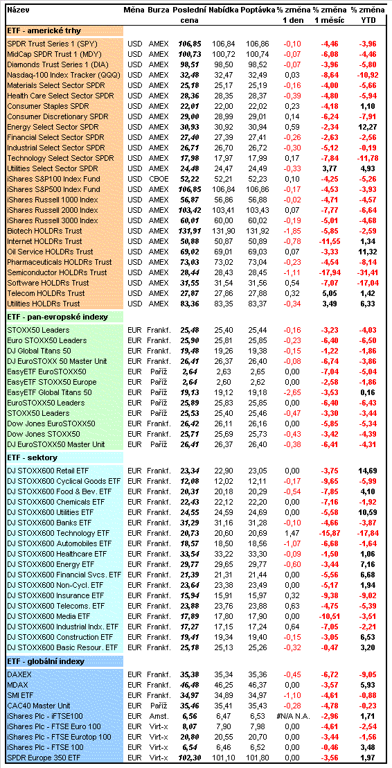 Patria přináší svým klientům přehled odpoledního vývoje tzv. Exchange Traded Funds (ETF). ETF jsou indexové podílové fondy, jejichž podkladovým aktivem je již existující index, které se obchodují jako akcie a umožňují tak investorům nakupovat nebo prodávat celé indexy ve formě jednoho konkrétního cenného papíru. Cena ETF se tvoří pohybem hodnoty jednotlivých indexů a nemůže tak dojít k odchylce mezi výkonností a výnosem daného indexu a jím sledovaného ETF. ETF jsou proto vyhledávaným produktem, který nahrazuje mnohdy nákladnější investování přes podílové fondy, jejichž tzv. „benchmarkem“ je vývoj daného burzovního indexu. V tabulce uvedené ceny jsou platné k okamžiku zveřejnění komentáře.