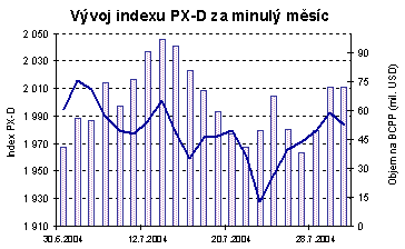 • Český akciový trh v červenci meziměsíčně poklesl o 0,4 %, měřeno indexem PX-50, který na konci měsíce uzavřel na 790,2 bodech. V dolarovém vyjádření index klesl o 1,1 % a je nyní o 49 % silnější než před rokem.