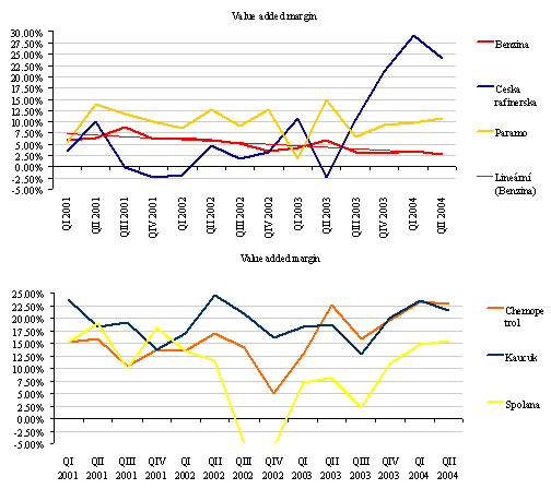 Uvedené je samozřejmě odrazem hospodaření dceřiných společností. Jeho výsek - marže na úrovni přidané hodnoty, je shrnut v následujících grafech. Je patrné, že ani u Čraf, ani u Benziny, nepřineslo druhé čtvrtletí zlepšení oproti prvnímu, naopak. Paramu se díky jeho produktovému portfoliu a restrukturalizaci daří marže dále zlepšovat. Pokles je znatelný i v petrochemii, výjimkou je restrukturalizující se Spolana, která se výrazně zlepšuje, ale má ještě co dohánět.