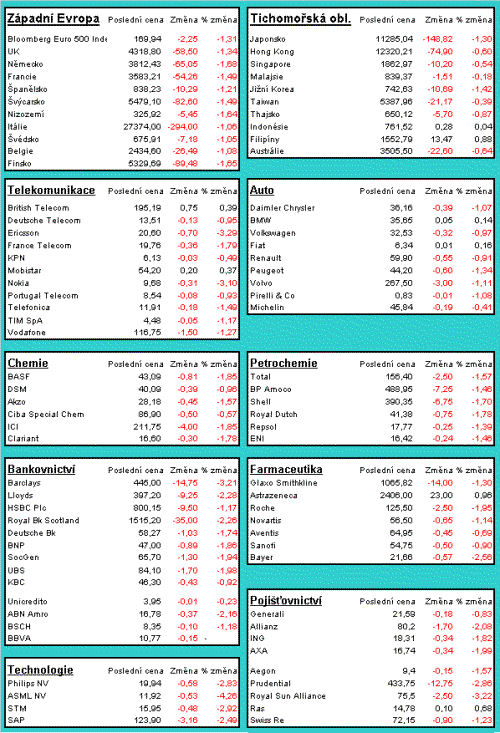 V následující tabulce naleznete přehled aktuální situace na akciových trzích západní Evropy a tichomořské oblasti. Data jsou statická, nicméně bez markantního zpoždění (k času zveřejnění tohoto komentáře). Tabulky obsahují jednak akciové indexy v regionu, jednak jednotlivé sledované akciové tituly rozdělené dle odvětvové struktury.