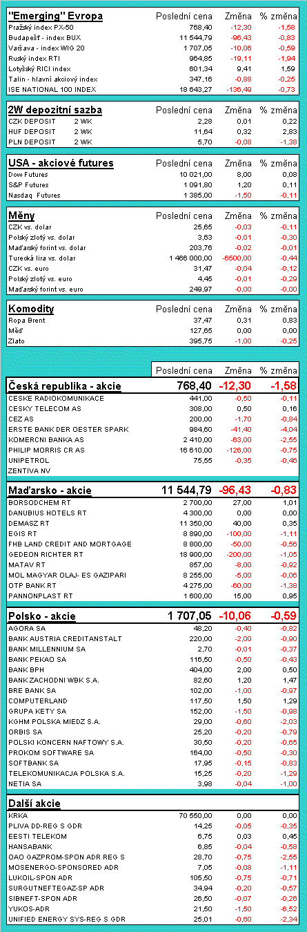 V následující tabulce naleznete přehled aktuální situace na akciových a finančních trzích střední a východní Evropy. Data jsou statická, nicméně bez markantního zpoždění (k času zveřejnění tohoto komentáře). Tabulky obsahují akciové indexy v regionu, kurzy středoevropských měn, vývoje regionálních blue-chips titulů a v neposlední řadě aktuální hodnotu futurit na americké akciové indexy.