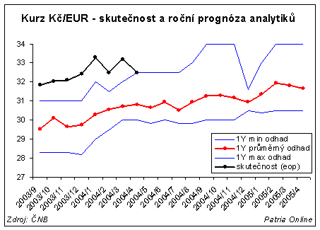 Skeptické vůči dalšímu vývoji české měny zůstává zahraničí, nicméně právě analytikům mimo Českou republiku se v dubnu podařilo zhruba „trefit se“ svou roční prognózou! V dubnu 2003 činil roční maximální odhad (ten tradičně pochází právě od zahraničních respondentů) 32,50 Kč za euro, kurz koruny přitom letos v dubnu v průměru dosahoval 32,47 Kč/EUR!