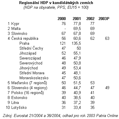 Ekonomická úroveň jednotlivých regionů je tak významná pro rozdělení prostředků z fondů EU. Z tabulky je zřejmé, že na tyto fondy nemá šanci dosáhnout Praha, která je se svými 135 % průměru na 16. místě v celé Evropské unii. 70procentní hranici překonal z kandidátských zemí už jen bratislavský region (102 %), jeden maďarský region (81 %) a Kypr (78 %). Zatímco Praha je v rámci ČR extrémem a naše ostatní regiony se pohybují kolem 50 % průměru EU, regiony v Polsku, Maďarsku i Slovensku tak vysoké extrémy nevykazují. Volba regionů je přitom v národní působnosti. Příjmy z EU jsou však jen jednou stránkou věci.