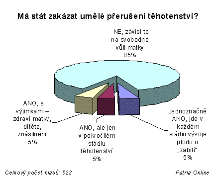 Anketa na Patria.cz na ožehavé téma o umělém přerušení těhotenství ukázala, že většina z hlasujících se přiklání k názoru ponechat ženám právo se svobodně rozhodnout, zda přivést či nepřivést dítě na svět. 445 hlasů (85,3 %) z celkových 522 to jasně dokazuje. Tito všichni hlasující se domnívají, že konečné rozhodnutí by mělo být zcela na ženě, která sama musí zvážit všechny aspekty spojené s přivedením dítěte na svět a zároveň tak na sebe vzít odpovědnost, že se rozhodne špatně. Anketa probíhala ve dnech 18.2. až 2.3. 2004.