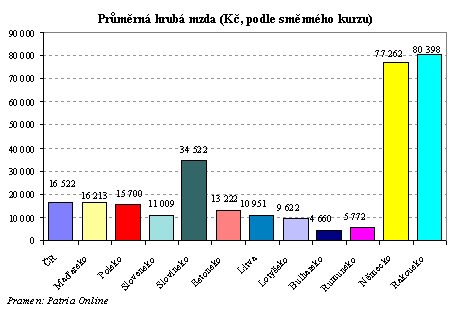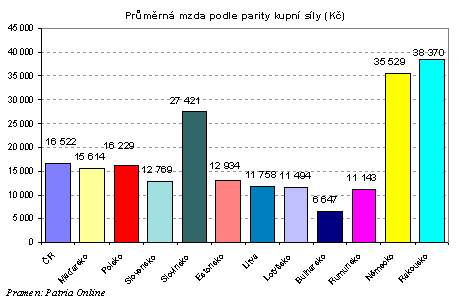 Na druhou příčku se vyšvihla ČR, kde mzdy v relaci k Německu odpovídají 21% podle kurzu a 47% podle parity kupní síly. Pokud bychom brali úroveň průměrné mzdy za měřítko životní úrovně byli bychom druzí nejbohatší mezi budoucími členy EU. Na třetí příčce při přepočtu mezd podle kurzu je Maďarsko, které dosahuje stejně jako ČR 21% německé úrovně. Podle parity je ovšem maďarská průměrná mzda pouze na 44% Německa. Následuje Polsko s 20% německé hladiny podle kurzového přepočtu, resp. 46% podle parity. ČR a Maďarsko předstihly Polsko, neboť v těchto dvou zemích se mzdy ve 3 čtvrtletí vzhledem k průměrné úrovni v loňském roce zvýšily o 5,2% (ČR), resp. 6,9% (Maďarsko), zatímco v Polsku pouze o 1,3%. Navíc ve stejném srovnání koruna vůči euru oslabila o 4,0%, forint o 6,6%, zatímco polský zlotý o 14,8%. Na chvostu visegrádské skupiny je Slovensko, kde průměrná mzda dosahuje zhruba 14% německého průměru podle kurzu, resp. 36% podle parity. Na obdobných úrovních jako Slovensko se pohybují pobaltské ekonomiky. Výrazně nižší jsou potom mzdy v Bulharsku a Rumunsku.