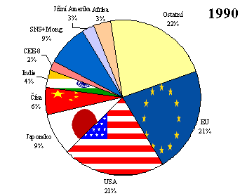 Rychlý růst čínského hospodářství zamíchal také strukturou celosvětové ekonomiky. V roce 1980 se podílela Čína na celosvětové produkci pouhými 3,4 procenta. O deset let později podíl Číny vzrostl na téměř 6% a v současnosti již činí 13%. Zatímco USA si svou pozici udržely a nadále produkují 21% celosvětové produkce, podíly Japonska a EU se ztenčily. Rozložení sil ve světové ekonomice a jeho změny dokumentují následující grafy. Pokud bude čínská ekonomika růst i nadále podobným tempem, za deset let předstihne, ve významu pro celosvětovou produkci současné EU. Nicméně Unii zpět na první příčku posune dvouprocentní podíl na celosvětové produkci generovaný novými členskými zeměmi.
