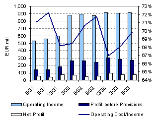 Co se týče ostatních provozních výnosů, očekáváme, že meziročně výrazně vzrostou, protože výsledky Erste Bank za druhé čtvrtletí 2002 byly negativně ovlivněny vytvořením rezervy ve výši 20 mil. EUR na pokutu, kterou uložila Evropská komise několika rakouským bankám (včetně Erste) kvůli jejich společné politice v oblasti úrokových sazeb a určitých poplatků.