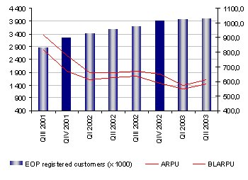 Graf potvrzuje pozitivní vývoj ARPU v HI 2003 a pokračující klesající mezní přírůstky počtu zákazníků tak, jak se celý trh blíží svému plnému nasycení.