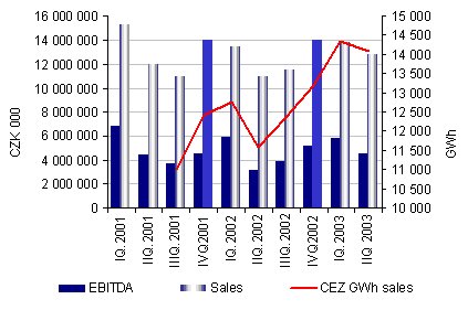 Následující graf ukazuje vývoj čtvrtletních tržeb, objemových prodejů a EBITDA ČEZ: