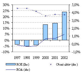 Ziskovost v bankovním sektoru v poslední době výrazně vzrostla (průměrná návratnost vlastního kapitálu ROE dosáhnula 24 % v roce 2002 oproti 12 % v roce 2000), což bylo hlavně důsledkem restrukturalizace největších domácích bank a převodu špatných úvěrů na stát. Ziskovost tak byla ovlivněna převážně zvýšením provozní efektivnosti (díky poměrně výraznému snížení počtu zaměstnanců) a radikálním snížením tvorby opravných položek a rezerv, oboje při stagnující výnosnosti aktiv, jak je patrné z následujícího grafu.