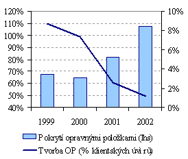 Druhým hlavním faktorem, který způsobil růst ziskovosti sektoru, bylo masivní převzetí špatných úvěrů státem a státní garance v hodnotě stovek miliard Kč, které byly poskytnuty bankám před jejich privatizací a poté, co ČSOB získala IPB (ČNB odhadnula celkové náklady na konsolidaci sektoru na 300 mld. Kč, odhad MMF dosahuje 400 mld. Kč). Státní pomoc vedla k vysokému pokrytí špatných úvěrů opravnými položkami a rezervami bank, což také způsobilo (vedle např. konzervativní úvěrové politiky) nízkou tvorbu těchto opravných položek, jak ukazuje další graf.