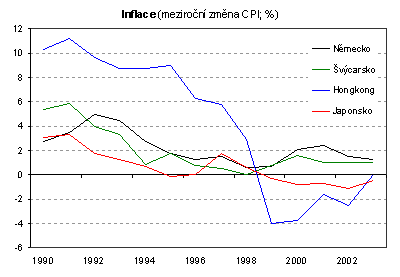 Impulsem k zájmu o deflaci bylo především varování Mezinárodního měnové fondu. MMF varoval před deflační nákazou a vysokou pravděpodobnost přiřknul zejména Německu. Dalšími kandidátem je podle IMF Švýcarsko a prohloubit by se mohla deflace v Japonsku a Hongkongu. Vývoj inflace v těchto zemích znázorňuje následující graf (data pro tento a následující grafy pochází z databáze MMF). Blízko jednoprocentní inflace se pohybují také Dánsko, Rakousko, Finsko a Belgie.