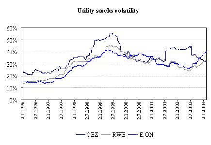 V roce 2000 ČEZ přestal být nejrizikovější investicí a stal se jí E.ON. Na začátku roku 2001 se pořadí opět mění, volatilita ČEZ rostla a převýšila rizikovost zbývajících dvou společností až o 15 %. Ve druhé polovině roku 2002 a na začátku letošního roku se rizikovost akcií ČEZ opět snižovala, v západní Evropě naopak rizikovost energetických společností rostla, a tak únoru 2003 byl ČEZ nejméně rizikovou akcií ze všech tří, když jeho volatilita poklesla na 31,6 %, volatilita RWE byla o 2 % vyšší a nejrizikovějším titulem se stal E.ON (40,8 %).