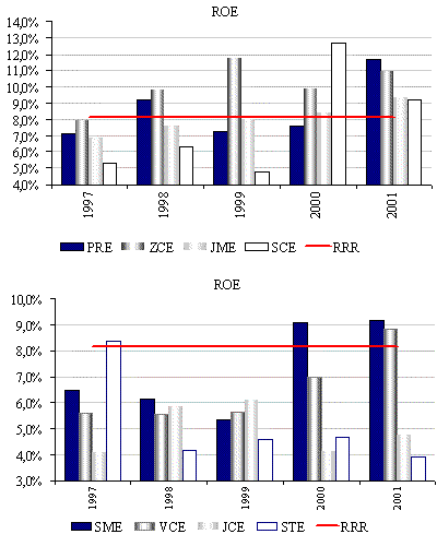 Zatímco v roce 1997 přesahoval RRR pouze poměr čistého zisku a vlastního kapitálu Středočeské energetické (v dalších letech klesal až v roce 2001 končí pod 4 %). Úrovni 8 % se přiblížila také Západočeská energetika, ostatní společnosti začínaly v roce 1997 na poměrně nízké úrovni. V následujících letech se situace obecně zlepšovala. Požadovanou míru návratnosti 8,2 % přesáhly už v roce 1998 ZČE, PRE a ZČE, jejíž návratnost vlastního kapitálu se v následujícím roce dále zvýšila, naopak ukazatel PRE spadl na 7 %. Výrazné zvýšení návratnosti vlastního kapitálu SČE v roce 2000 způsobil prudký nárůst zisku téměř na trojnásobek oproti roku 1999. Signifikantní nárůst ROE v roce 2000 zaznamenala také Severomoravská energetika, jejíž zisk oproti předchozímu roku vzrostl o 90 %. V roce 2001 nedosahovaly požadované míry návratnosti pouze Jihočeská energetika a Středočeská energetická, jejíž ROE bylo nejnižší ze všech distribučních společností (3,9 %). Naopak nejvyšší míru návratnosti vlastního kapitálu v roce 2001 vykazovala Pražská energetika (11,7 %).