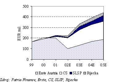 Na druhé straně akvizice ve střední Evropě stále více přispívají ke konsolidovanému zisku Erste Bank, jak o tom vypovídá níže uvedený graf. Očekáváme, že Česká spořitelna v minulém roce zvýšila svůj příspěvek k čistému zisku EB o téměř 2,86 mld. Kč (buď přímo nárůstem svého zisku nebo díky vyššímu vlastnickému podílu Erste) a měla by prakticky vykompenzovat zhoršené výsledky EB na rakouském trhu. I v roce 2003 bude pokles minoritních účastí na zisku České spořitelny (v porovnání s rokem 2002) významně přispívat ke konsolidovaným výsledkům (dodatečnými 1,43 mld. Kč). Růst čistého zisku Slovenské spořitelny a chorvatské Riječka banky v roce 2003 dále pomůže konsolidovanému zisku skupiny (o 730 mil. Kč, resp. 350 mil. Kč).