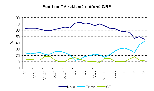 Podle průzkumu TNS vzrostly hrubé výdaje za TV reklamu v březnu o 392 mil. Kč (+23 % meziročně) na celkových 2,07 mld. Kč. V březnu odvysílaly televizní stanice o 61 hodin reklam více v porovnání se stejným obdobím minulého roku. Podíl TV Nova poklesl, když odvysílala o 15 hodin reklam méně, zatímco její největší rival TV Prima zvýšil čas reklam o 76 hodin. Podíly stanic na TV reklamě (měřené GRP body) se během roku podstatně změnily s nepříznivým vývojem pro TV Nova. Její dominance nad Primou se scvrkla během roku na 3,3 procentního bodu z 51,6 procentního bodu z minulého března. Historicky nejnižší podíl TV Nova je 45,8 % v porovnání s 42,5 % TV Prima. Jak jsme již upozorňovali situace se může ještě zhoršit před tím než se zlepší, což je v souladu s našimi očekáváními. Tato čísla také potvrzují fakt, že TV Nova navrhla zvýšení cen TV reklam a to způsobilo zpoždění a počáteční negativní reakci mediálních agentur. Očekáváme, že výsledky za 1Q06 budou slabé (zveřejnění 4. května 2006) a jakékoli možné oslabení může znamenat vhodnou příležitost ke koupi akcií společnosti CME.
