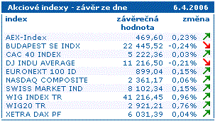 V rámci indexu Dow Jones zaznamenaly nejhorší výsledek akcie farmaceutického Mercku, ty ubraly na hodnotě 1,15 USD (-3,2 %) na částku 34,84 USD, když soud v New Jersey rozhodl, že Merck bude muset zaplatit pokutu 4,5 milionů USD staršímu muži, jemuž užívání léku Vioxx proti bolesti způsobilo selhání srdečních funkcí. Největší nárůst v rámci zmiňovaného benchmarku naopak zaznamenaly akcie 3M Co. (+3,9 %), když zisk za první čtvrtletí dosáhl hodnoty 1,15 až 1,16 USD na akcii, což je o poznání více než činily původní odhady ve výši 1,10 až 1,14 USD. Pozadu včera nezůstal jen technologický sektor, který vedly druhým dnem vpřed akcie Apple Computer, po zprávě, že Apple umožní spuštění systému Windows XP na svých počítačích. Technologický index Nasdaq tak končil včerejší seanci s mírným posílením o 0,06 %, index Dow Jones klesl o 0,21 %, širší S&P 500 ztratil podobně 0,19 %.