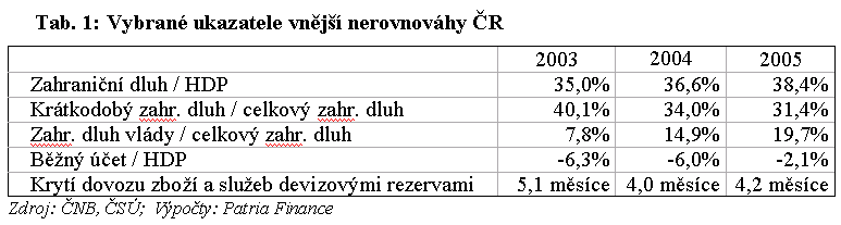 Vývoj zahraničního dluhu ČR prošel několika fázemi. Do roku 1997 v poměru k HDP zvolna stoupal. Poté se stabilizoval a osciloval kolem úrovně 40 % HDP. V roce 2000 se tento poměrový ukazatel vydal na sestupnou dráhu a klesl až na 31 % HDP. Poslední tři roky ovšem opět zvolna vzlíná. Příčiny? Vydatně ke zvýšení zahraničního dluhu přispěl především veřejný sektor. Pro ilustraci: Za poslední dva roky zahraniční dluh stoupl o 231 mld. Kč, vláda si ve stejnou v zahraničí vypůjčila 152 mld. Kč. Předloni i loni vydalo ministerstvo financí dluhopisy denominované v eurech, byly i čerpány přímé půjčky na vládní i regionální úrovni a započítat je nutné také leasing stíhacích letounů Gripen. Podíl závazků vlády na celkovém zahraničním dluhu stoupl na 20 % z 15 % v roce 2004 a 8 % v roce 2003. O zbytek zvýšení zahraničního dluhu se postaral firemní sektor. Zahraniční zadluženost bank se měnila minimálně.