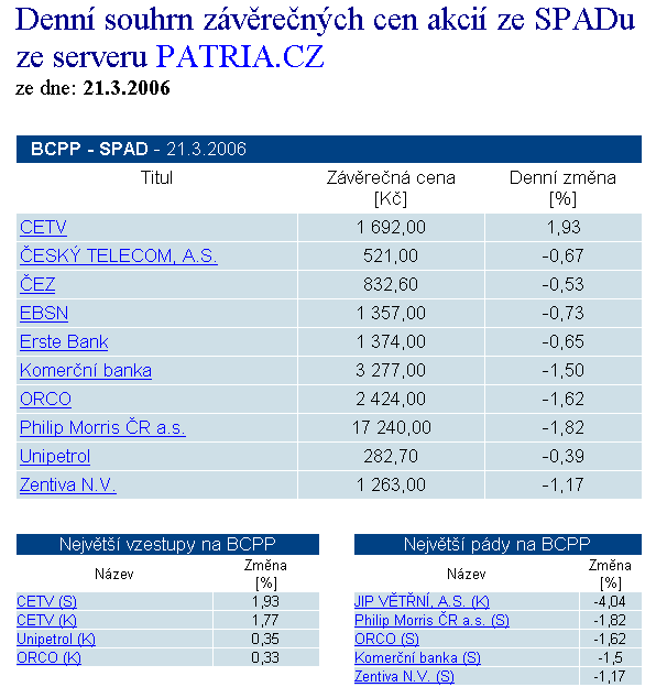 Pražská burza v úterý kopírovala negativní vývoj na zahraničních trzích a seanci uzavřela se ztrátou 0,66 %, měřeno indexem PX. V záporu uzavřely také okolní trhy - maďarská burza s poklesem o 0,4 %, polský trh pak oslabil o 0,7 %. Dnešní obchodní aktivitu na pražské burze lze označit jako nadprůměrnou. Celkový objem obchodů ve SPADu přesáhl 3,5 mld. Kč, z čehož více než 1,4 mld. Kč tvořily obchody s akciemi ČEZ. Titul po oznámení konsolidovaných výsledků za rok 2005 procházel smíšeným vývojem. Denní maximum činilo 845 Kč, denní minimum 827 Kč, závěrečný kurs se ustanovil na 832,6 Kč (-0,5 %), vážený průměr cen dnešních obchodů pak činil 835,15 Kč. Lze tedy konstatovat, že vliv výsledků hospodaření byl převážen celkovým, spíše prodejním, sentimentem.