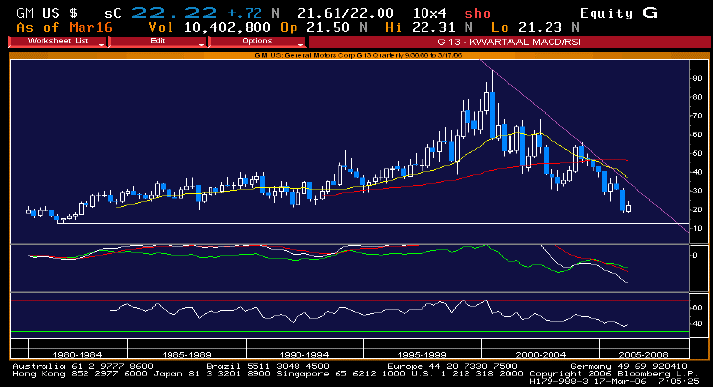 Z dlouhodobého grafu vývoje akcie General Motors s čtvrtletními daty je zřetelně vidět, že akcie může dále OSLABOVAT. Klíčovou úrovní pro sestup ceny akcie je zřejmě hladina z roku 1981, tj. 12,70 USD. Poslední cena akcií GM na burze dosahovala 22,2 USD.