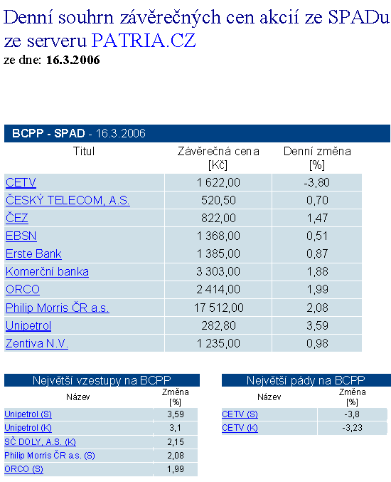 Pražská burza uzavřela předposlední seanci tohoto týdne se ziskem více než 1 %. Index PX-D konkrétně narostl o 1,1 % na 3938 bodů, když hlavními tahouny jeho posílení se staly především akcie ČEZ, KB a Unipetrolu. Akcie ČEZ přidaly 1,5 %, avšak po ranním nárůstu se za oboustranného zájmu držel v relativně úzkém pásmu. Unipetrol naproti tomu, podpořen vývojem ostatních petrochemických titulů v regionu, poskočil o 3,6 % výše na závěrečných 282,8 Kč. Akcie KB se v závěru seance těšily převažujícímu nákupnímu zájmu a zpevnily nad 3300 Kč (+1,9 %). Dvouprocentní nárůsty pak také zaznamenaly akcie Orco a Philip Morris CR. Ze záporu se po oznámení úpisu nových akcií naopak nevymanily akcie CETV (-3,8 %).