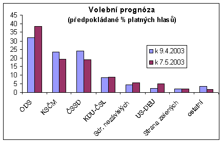 Pokud by se konaly parlamentní volby v květnu, stala by se jednoznačným vítězem ODS s 38,4 procenty hlasů. Vyplývá to z dnes zveřejněného průzkumu společnosti TNS Factum. ODS by pravděpodobně získala dvakrát více hlasů než ČSSD (18,9%) i KSČM (19,2%). Ve srovnání s dubnovým průzkumem poklesla volební prognóza u ČSSD (z 24,1%), KSČM je zhruba stabilní, i když ani jí se v květnu nedařilo, nicméně překonala ČSSD.