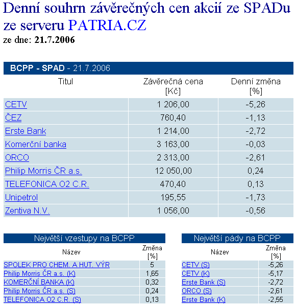 Zdaleka nejhůře si vedly akcie CETV, které dík výprodeji v USA propadly o 5,3 %. Zdá se tedy, že očekávání investorů před zveřejněním pololetních výsledků společnosti jsou nevalná. S více než 2,5procentními ztrátami uzavřely akcie Erste Bank a Orco. S červenou nulou skončily akcie KB. V kladném teritoriu se pak udržely jen dividendou lákající akcie Telefonica O2 a nelikvidní Philip Morris ČR.