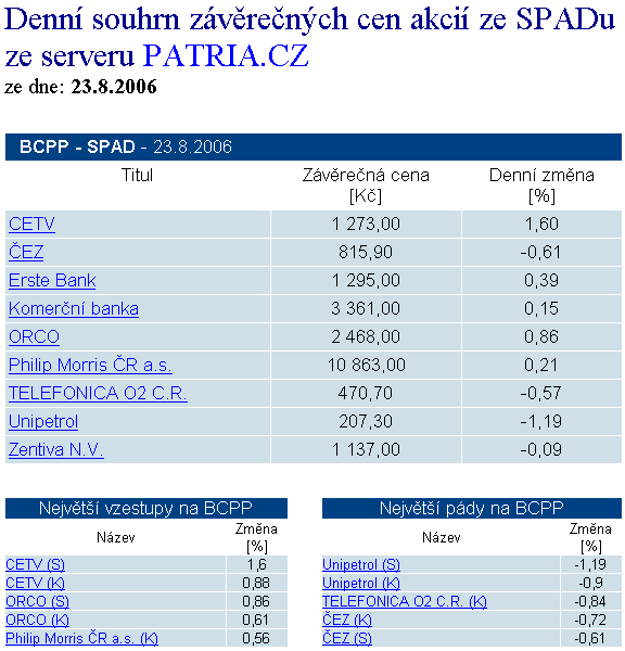 Naopak nejvýkonnějším titulem se staly akcie CETV, které si při bídné obchodní aktivitě polepšily o 1,6 %. Nákupní zájem v odpoledních hodinách převládal u akcií Orco. Ty, zdá se, sílí pod vlivem spekulací na lepší pololetní výsledky, které mají být zveřejněny 31.8.
