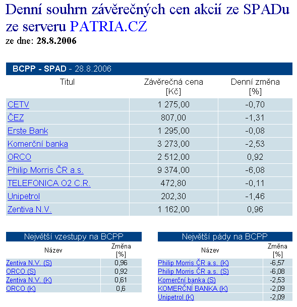 Zatímco většina západoevropských burz stačila zareagovat na pozitivní vývoj na druhé straně Atlantiku, tak domácí trh, společně s polským a maďarským, zůstal pozadu. Nejvíce dolů trh táhly akcie Komerční banky, která se propadla až k 3270 Kč . Dalších 6 % ztratil Philip Morris, který ani technicky nenašel podporu na 10 000 Kč a dnes jeho cena klesala až k 9400 Kč, když jeden obchod v Kobosu proběhl za cenu 9 144 Kč. Kromě Komerční banky převažovali prodejci na ČEZu a také na Unipetrolu.